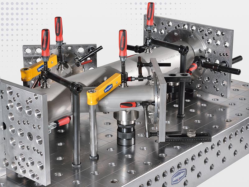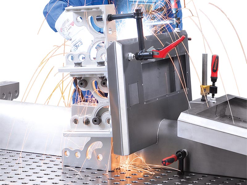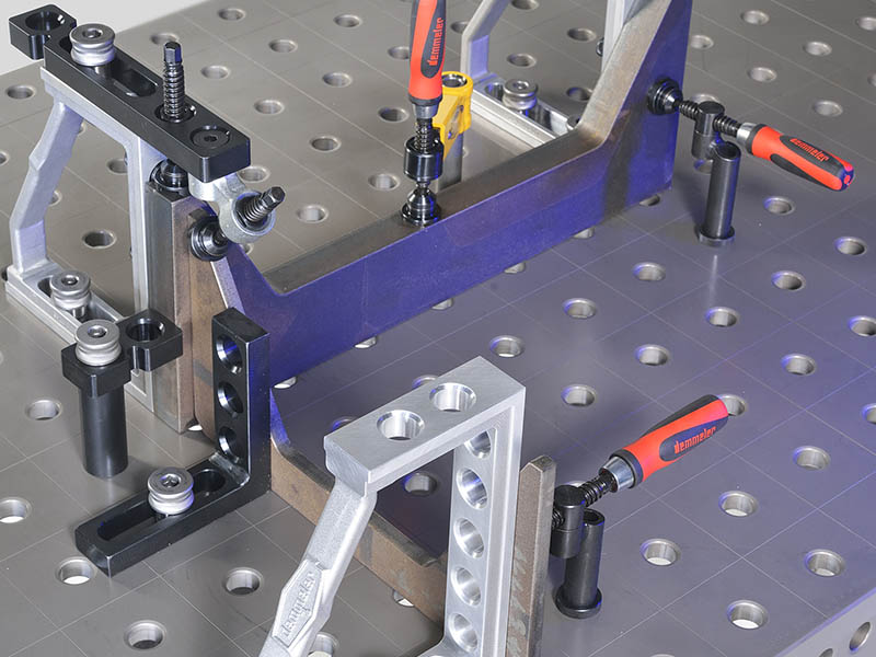 Besonders in der Schweißtechnik kennen Sie als Anwender Ihre Probleme bei der Herstellung von z.B. Maschinengehäusen, Gestellen, Rahmen, Traversen, Konsolen, Geländern und Treppen, Toren oder unterschiedlichster Blechverkleidungen am besten. Zeitintensive vorarbeiten wie Messen, Anreißen und das nachjustieren oder aber der kostenintensive Bau von Sondervorrichtungen gehen nicht nur an das Portemonnaie sondern sind am Ende ein Wettbewerbsnachteil im Bezug auf Lieferzeit und Preis. Mit dem Demmeler 3D-Spannsystem können Sie sowohl im horizontalen als auch vertikalen Bereich alle Anforderungen erfüllen und sparen aufgrund des Lochrastersystems im Planquadrat deutlich an Rüstzeit. Aufwändiges nacharbeiten entfällt somit komplett. Aufgrund der vielfältigen Einsatzmöglichkeiten und der umfangreichen Ausstattungsvarianten der Tische sowie des Zubehör stehen wir Ihnen jederzeit gerne für individuelles Gespräch in Ihrem Haus zur Verfügung. Bitte sprechen Sie uns an!