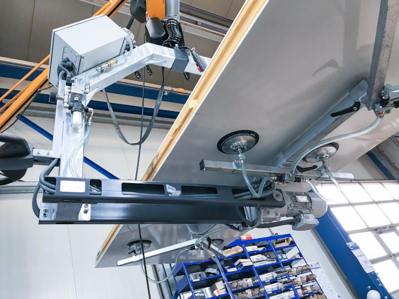 Wendelifter ermöglichen die Bearbeitung von 2 Seiten. Bequem können Sie das Transportgut mit dem Wende-Vakuumheber von 0 bis 180° schwenken. Egal ob Sie in der Qualitätskontrolle beide Seite eines Blechs oder einerPlatte auf Beschädigungen überprüft müssen, beidseitig bearbeiten müssen oder Furnier auf Holzplatten aufgebracht werden muss, die AERO-LIFT Wendegeräte machen das Arbeiten durch den elektrischen Schwenkmotor zu einem Kinderspiel. Platten und Bleche mit einem Gewicht von mehreren hundert Kilo können mit einem Knopfdruck ohne Kraftaufwand mit der Wendetraverse um 180° gewendet werden.