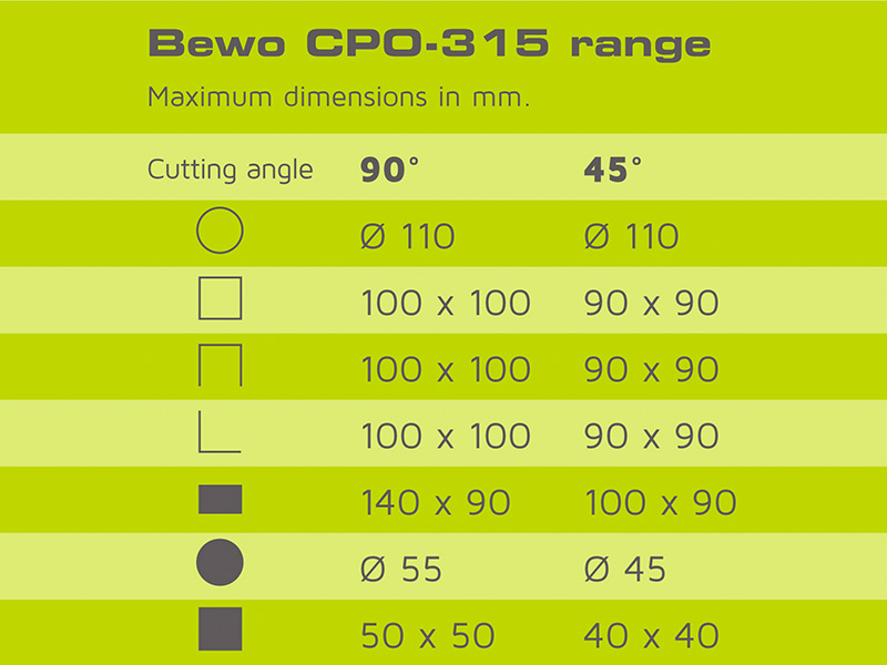 Es gibt zwei Typen Bewo CPO-Kreissägemaschinen: die Bewo CPO-315 und die Bewo CPO-315 PK. Beide Maschinen sind verfügbar in niedertouriger Ausführung (LT) für rostfreien Stahl und normalen Stahl und in hochtouriger Ausführung (HT) für normalen Stahl und Non-Ferro Materialien.