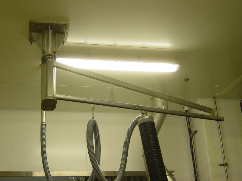An einer Säule montierter Schwenkausleger für den Einsatz eines Schlauchhebers. Der große Schwenkbereich beträgt 270°,die Ausleger sind mit unterschiedlichen Längen und Tragfähigkeiten lieferbar.