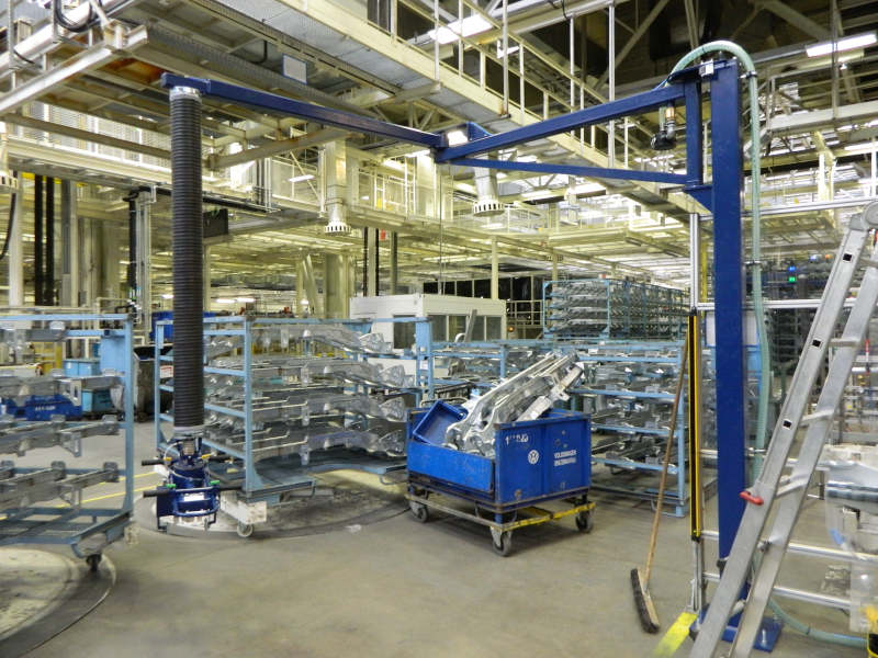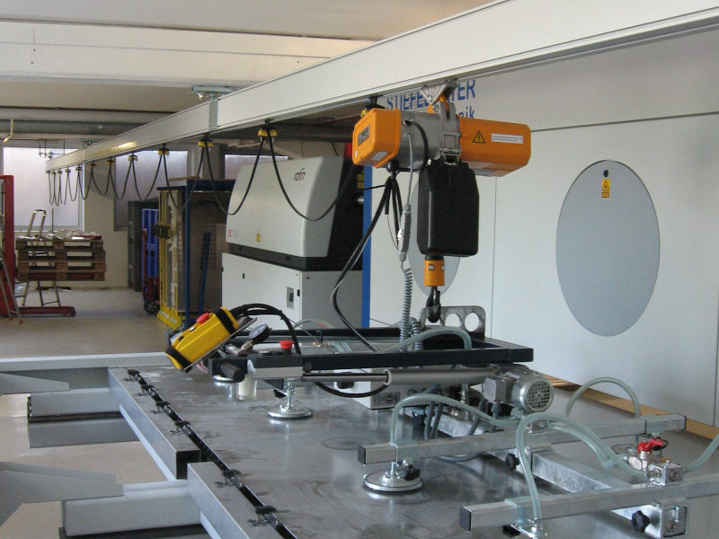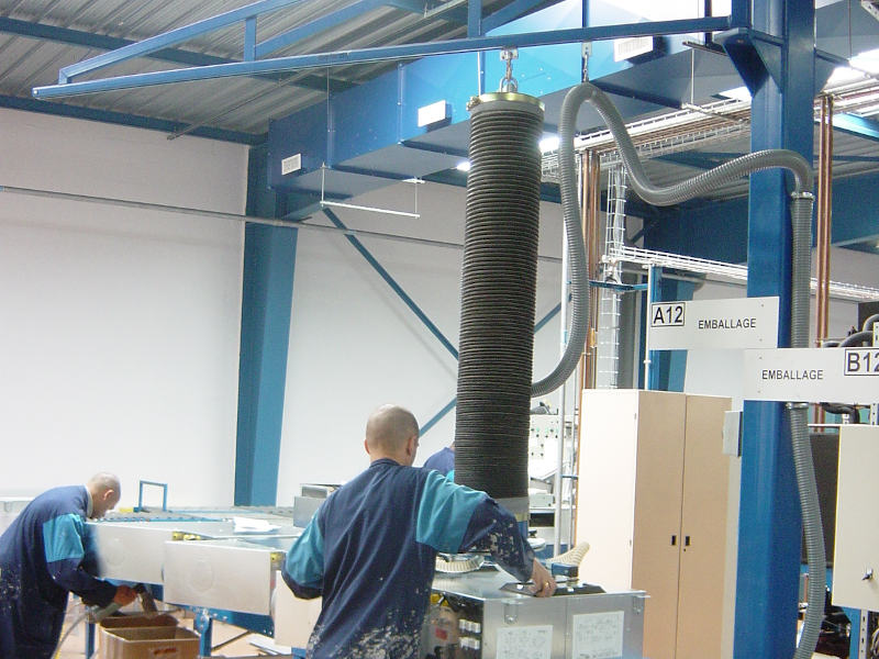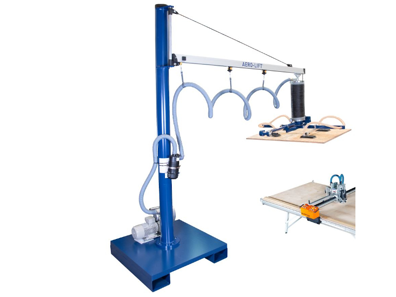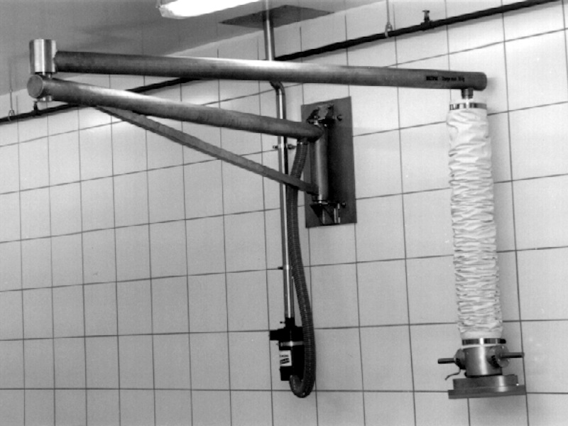 Zur Säulen-, Wand- oder Deckenbefestigung geeignet. Ermöglicht das Umfahren von Störkonturen wie Pfeiler oder Maschinen im Arbeitsbereich und kann trotz ungünstiger Raumverhältnisse die Verwendung eines Vakuumschlauchhebers ermöglichen. Durch die im Auslegerarm integrierte Vakuumführung sind am Knickarmausleger keine Schläuche notwendig, die herabhängen und das Arbeiten behindern können.